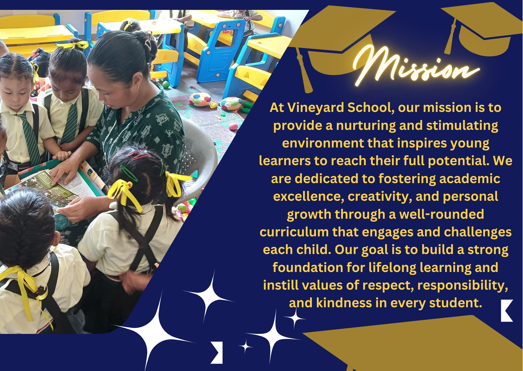 At Vineyard School, we believe in a holistic approach to education. Our dedicated teachers work tirelessly to create engaging and interactive lessons that foster a love for learning. We emphasize the importance of foundational skills while encouraging curiosity and creativity.